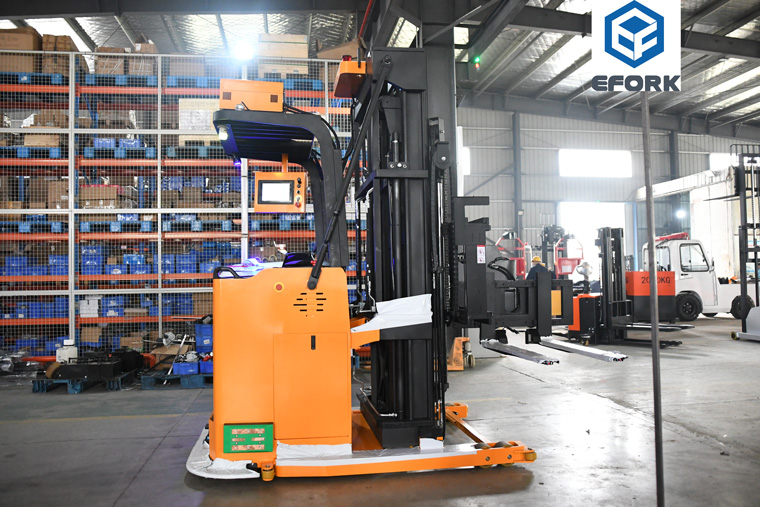 The body in the narrow passage does not need to turn, and the cargo stacking and loading on both sides of the roadway are realized through the 180° rotation of the cargo fork and the left and right side movement. The minimum channel distance is only 1600mm, and the ultra-narrow channel saves space and greatly increases the storage capacity.